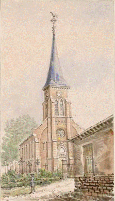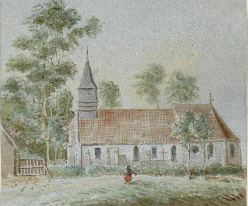 Ancienne église en 1872, aquarelle d'O.Macqueron, bibliothèque d'Abbeville.
